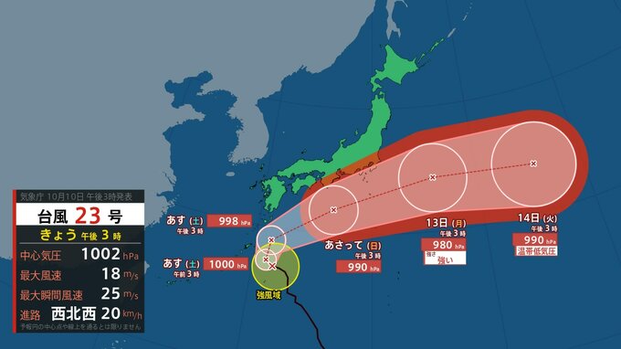 気象庁によりますと、台風第23号は、きょう(10日)午後3時には南大東島の北北東約150キロにあって、1時間におよそ20キロの速さで西北西へ進んでいます。