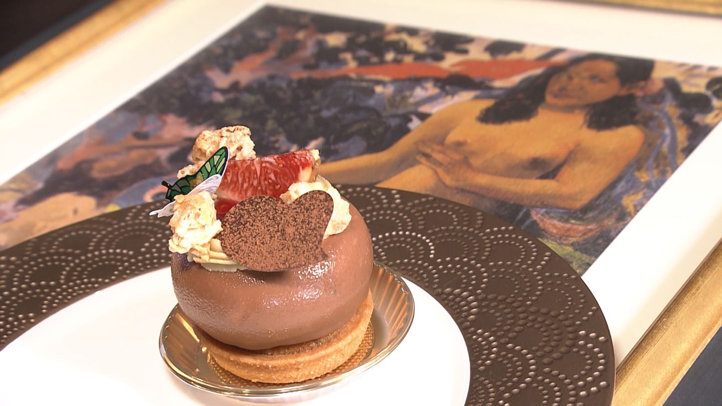 さらに、倉敷市浦田にある《パティスリー・オクサリス》では、ゴーギャンの《かぐわしき大地》をモチーフにしたムースケーキを販売しています。