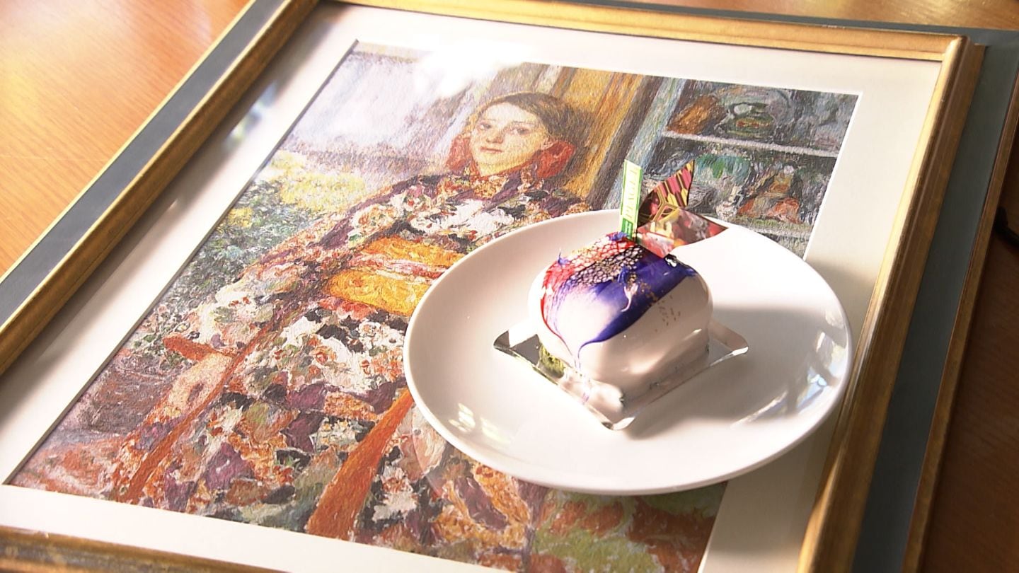「児島虎次郎が描いた絵を知らない人も来店されることも多いんですけど、そういう方(絵を知らない人)でもこの絵を表現したんだと照らし合わせながら見ることで、ケーキと絵を見比べながら楽しんでいただけたら」