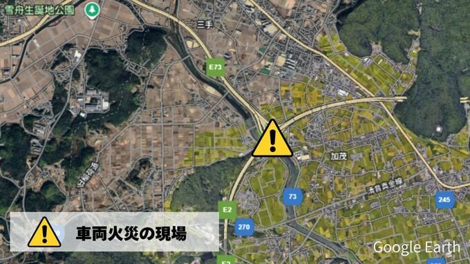 きょう(10日)午後6時45分ごろ、山陽自動車道(下り)の岡山JCT付近で、「乗用車1台が燃えている、前から煙が出ている」と消防に通報がありました(【画像①に現場の地図】)。