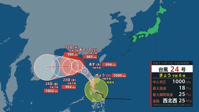 台風はきょう(19日)午前6時現在フィリピンにあって、1時間におよそ25キロの速さで西北西へ進んでいます。