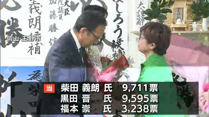 三つ巴の争いとなった玉野市長選挙は、現職の柴田義朗氏が大接戦を制し、再選を果たしました。