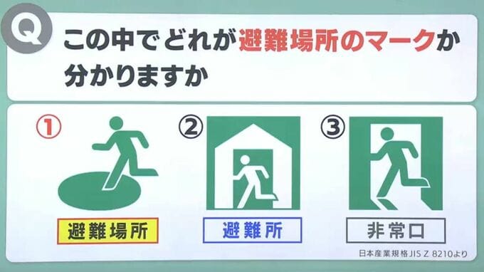 【防災クイズ】災害への備え 災害時の「避難場所」を示すマークはどれでしょうか?【岡山】 2025年10月24日(金) 10:00 岡山 避難場所のマークは? 画像② 正解は、(1)です。(2)は避難所のマーク、(3)は非常口のマークでした。(画像②)