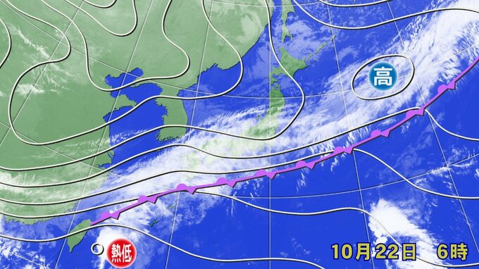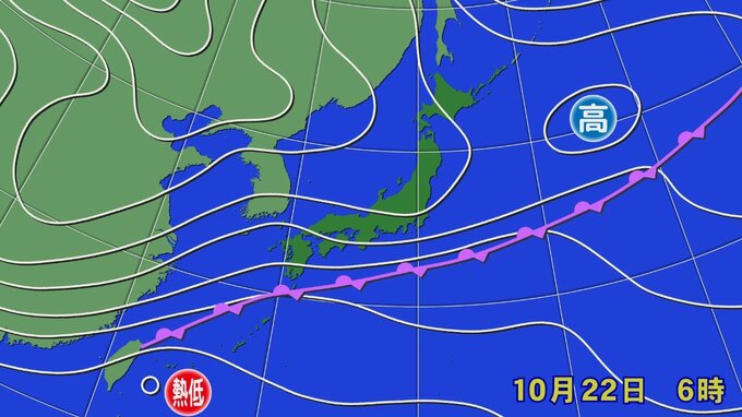 「きょう(22日)午前6時の天気図【画像②】です。秋雨前線は今週金曜日ごろにかけて停滞する見通しで、伊豆諸島や南西諸島、太平洋側の地域では雨が降りやすくなるでしょう。同じ場所に雨雲がかかり続け、大雨になるおそれがあります」