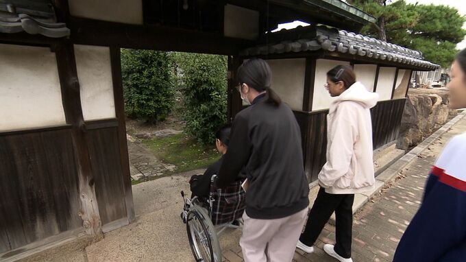 実習には、興陽高校家政科・被服デザイン科の3年生20人と、岡山医療福祉専門学校介護福祉学科の1年生30人が参加しました。交流を通して福祉・介護分野への学びを深める機会になればと企画されたもので、高校生が案内役となり、校内にあるバリアフリーを取り入れた庭園などを車いすでめぐりました。