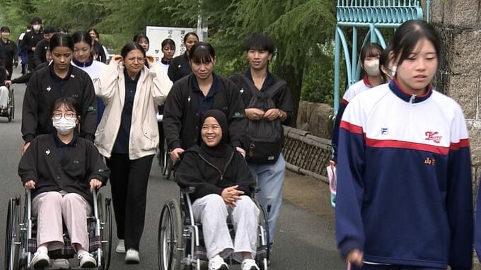 福祉を学ぶ高校生と専門学校生の連携・交流を深めようという初めての取り組みです。岡山市南区の岡山県立興陽高校で、車いすを使った実習が行われました。