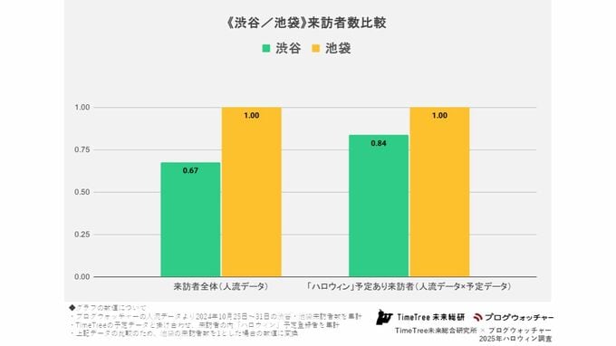 2024年のハロウィーンウィークのデータでは、来訪者数全体では渋谷は池袋の約67%にとどまりましたが、「ハロウィーン」関連の予定がある来訪者に限ると約84%まで上昇。