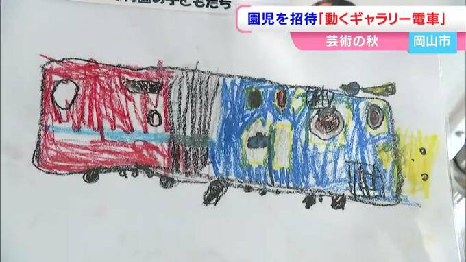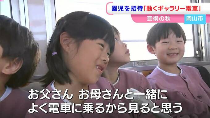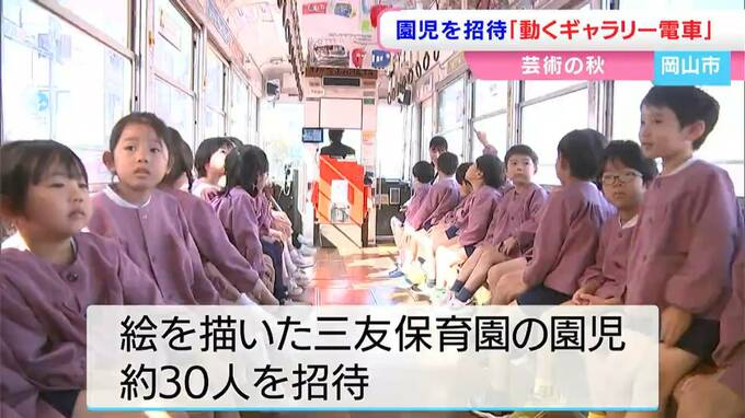 岡山電気軌道が運行を始めた「動くギャラリー電車」です。運行初日のきょう(30日)は、絵を描いた岡山市中区の三友保育園の園児約30人が招かれました。
