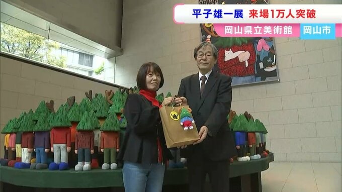 1万人目の来場者となったのは、熊本から2泊3日で岡山を旅行中の嶋田さんです。岡山県立美術館の守安館長から平子さんのサイン入り図録とオリジナルグッズが贈られました。