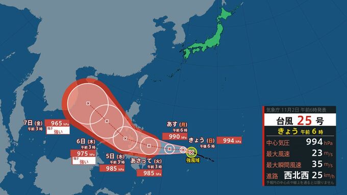 台風25号は、きょう(2日)午前6時にはフィリピンの東にあって、1時間に25キロの速さで西北西に進んでいます。中心気圧は994ヘクトパスカル、中心付近の最大風速は23メートル、最大瞬間風速は35メートルとなっています。