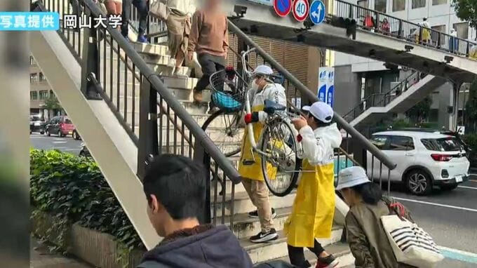 お運びボランティアは交通規制のかかった道を通行人が歩道橋などを使って横断する時に、自転車やベビーカーを代わりに運ぶボランティアです。参加するグループの一つがさきほどの学生たちのグループです。