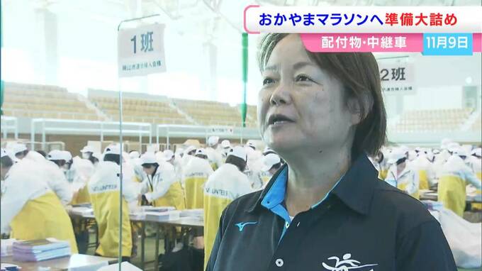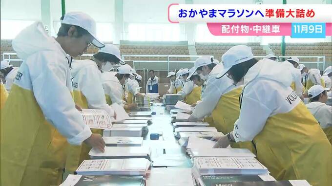 あさって(9日)開催される「おかやまマラソン」で、ランナーに渡すプログラムの袋づめやテレビの中継に向けた準備が進んでいます。