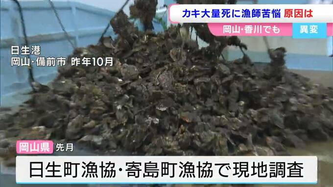 カキの大量死は岡山県でも起きていて、県は先月、日生町・寄島町漁協で現地調査を実施。また、生産量日本一の広島県でも同様の事態となっていて、きょう(19日)鈴木憲和農水大臣が養殖場の視察に訪れるなど、異例の事態となっています。