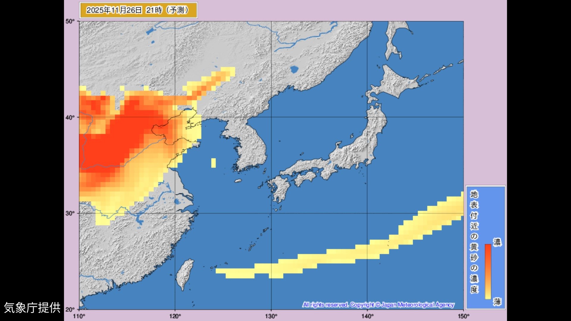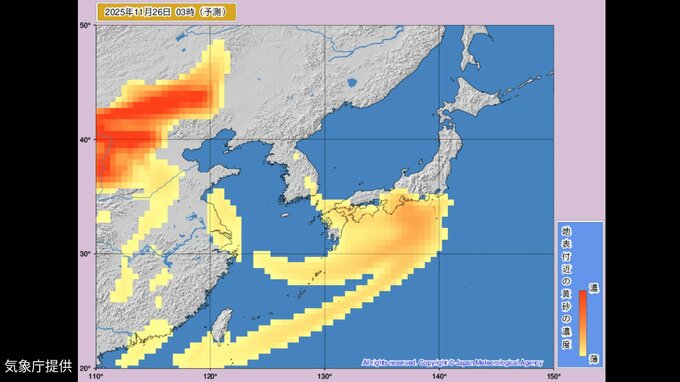 【黄砂予測】黄砂が来る?!あす24日(火)西日本に あさって25日(水)に関東地方の一部地域にも飛来する見込み【気象庁シミュレーション 24日午後3時更新】 2025年11月24日(月) 15:17 岡山 26日(水)の黄砂はどうなる? 26日(水)の黄砂のシミュレーションは、【画像⑫~⑭】のとおりです。 【画像⑫】 【画像⑬】 【画像⑭】