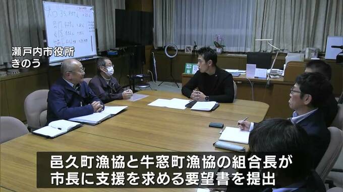しかし、今年は、邑久町漁協では1年ものが5割以上、2年から3年ものは9割以上が死滅し、深刻な状況となっています。そんな中、2漁協の組合長は、金融機関からの借入や支払いについての支援を求めました。