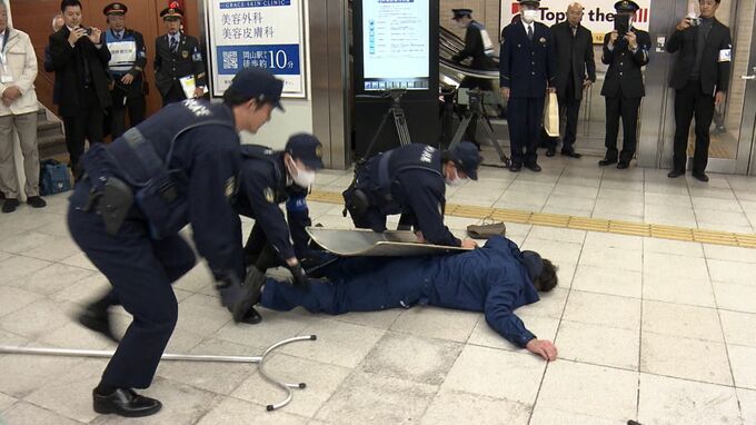 訓練は、JR岡山駅の改札で不審者が刃物で駅員を脅して駅構内に侵入し、駅の利用客を切り付けたという想定で行われました。約60人が参加した訓練では、警察が駆けつけるまでの間に、JRの社員が利用客の避難誘導や、防護盾を使って不審者と距離をとる方法などを確認していきました。