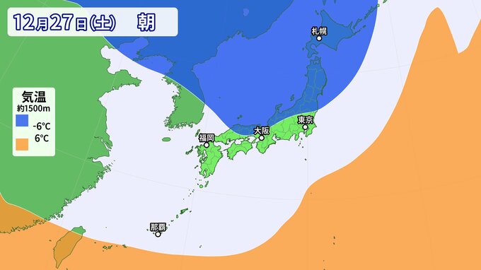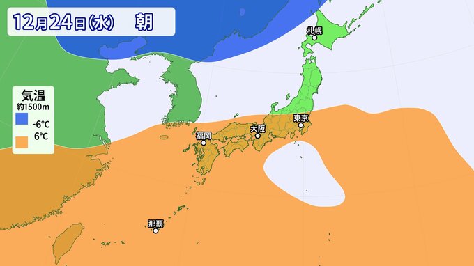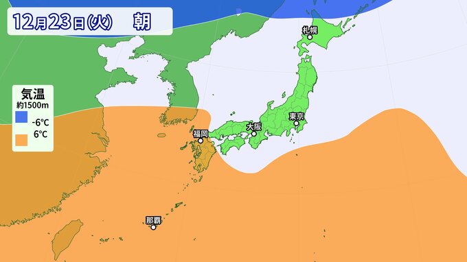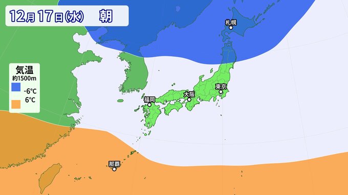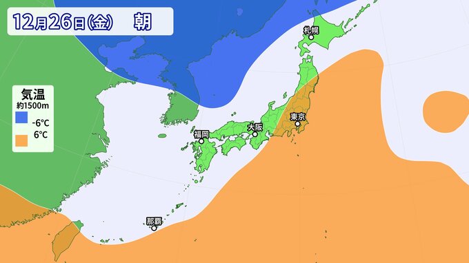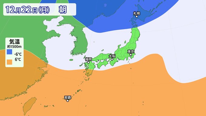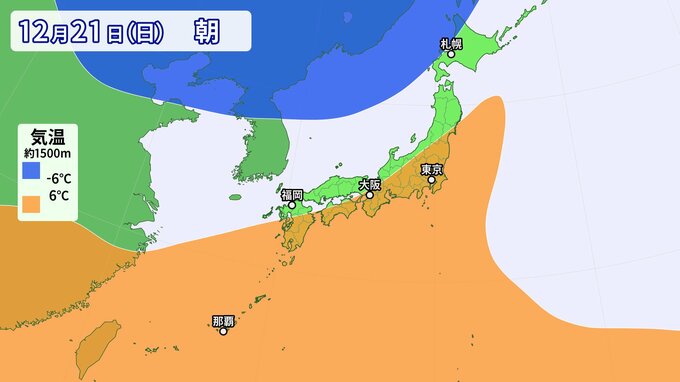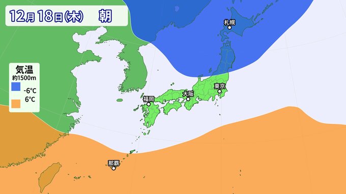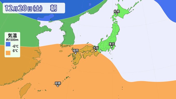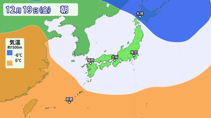 上空約1500mの暖気と寒気の予想を見ても、週後半にかけて暖気が流入することが分かります。このオレンジ色の暖気に覆われて日中晴れれば、気温が20度ほどまで上がる可能性があります。北からの寒気の流れ込みも弱く、全国的に気温が次第に高くなる傾向です。