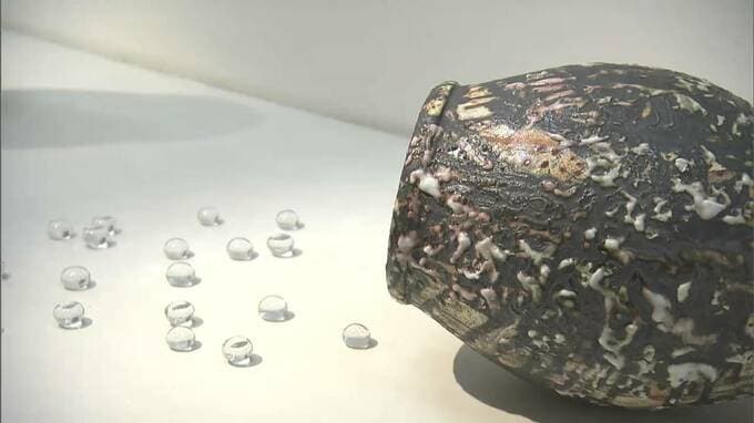 ガラス作家・戸田晶子さんが手がける複雑な色合いのガラス玉【画像②】に、陶芸家・小孫哲太郎さんが沖縄の伝統技法を用い釉薬で彩った壺【画像③】です。