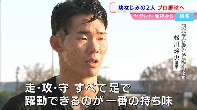 松川選手は、50メートル5秒88の俊足を誇る、走攻守3拍子揃った身長183センチ81キロの大型ショート。1年秋から5季連続でベスト9に輝きました。