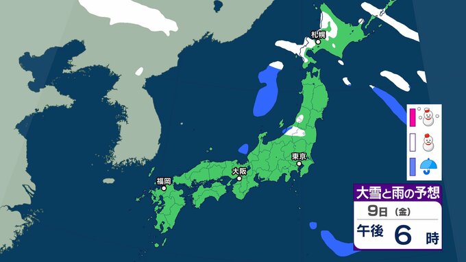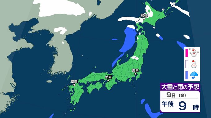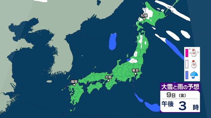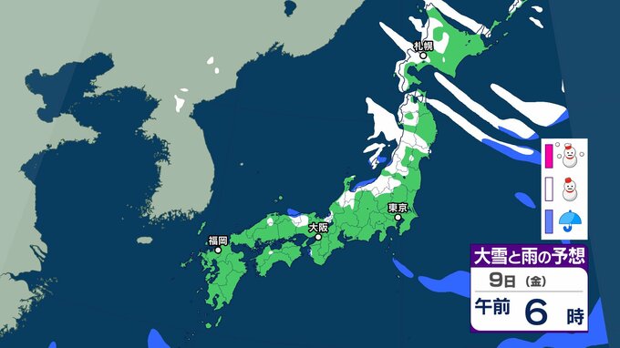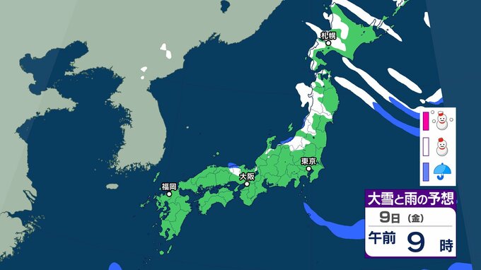 気象庁によりますと、きょう(9日)は冬型の気圧配置は緩みますが、寒気が残るため降雪が強まり大雪となるところがあります。北から東日本では、9日はじめは、大雪や着雪、なだれに注意してください。