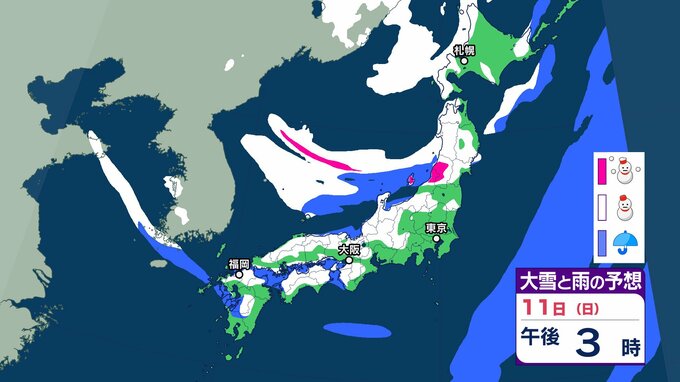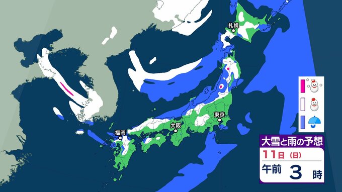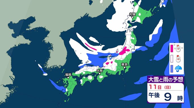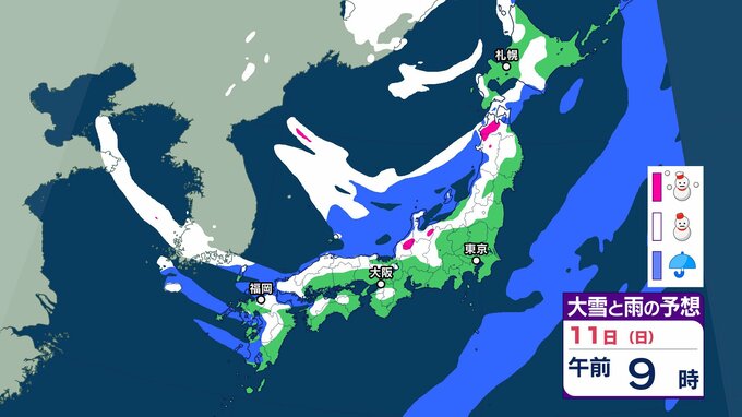 気象庁によりますと、11日は強い冬型の気圧配置となり、北日本には-12~-15℃、東~西日本には-9~-12℃の強い寒気が流入し、降雪が強まり大雪となるところがある見込みです。