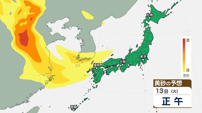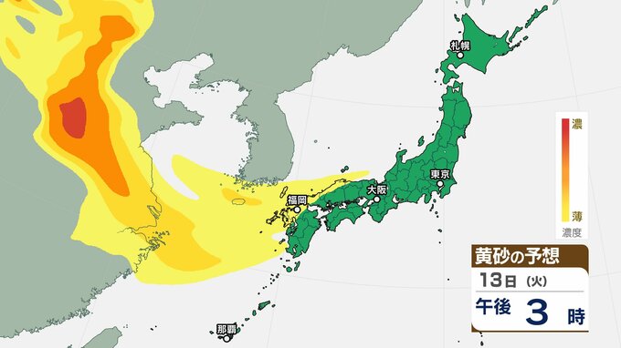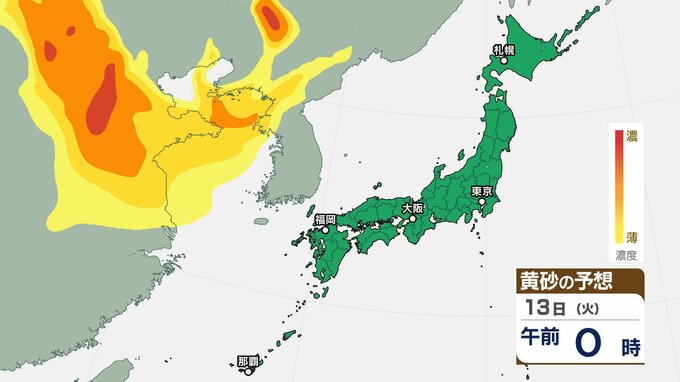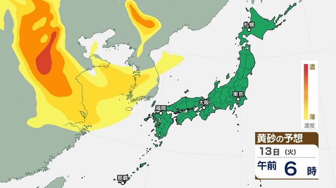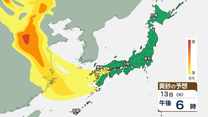 【黄砂情報】 13日(火)から日本列島に飛来の見込み 15日(木)は広い範囲で影響か 屋外の洗濯物やアレルギー対策などに注意 黄砂シミュレーション【気象庁 12日現在】 2026年1月12日(月) 10:00 香川 天気 13日(火)の黄砂はどうなる? 13日(火)の黄砂のシミュレーションは、【画像②~】のとおりです。九州・中国地方の一部地域に飛来が予想されています。 【画像②】 【画像③】 【画像④】 【画像⑤】 【画像⑥】 【画像⑦】 【画像⑧】 【画像⑨】