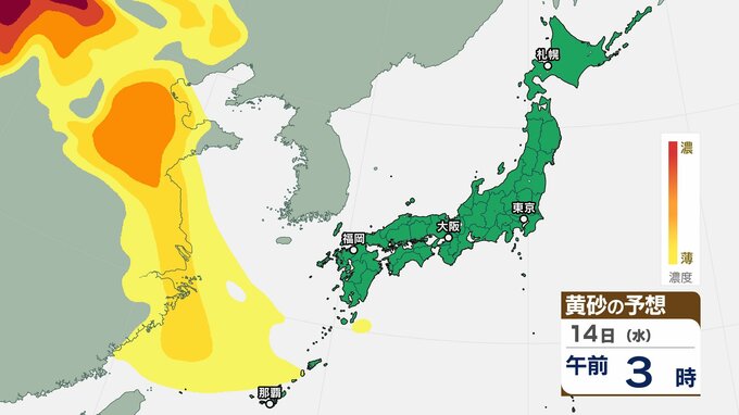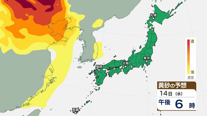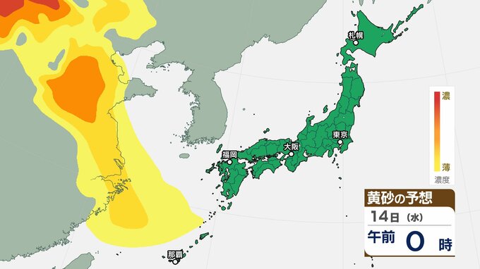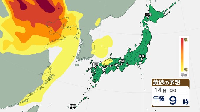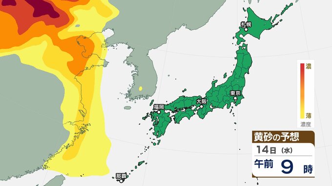 【黄砂情報】 13日(火)から日本列島に飛来の見込み 15日(木)は広い範囲で影響か 屋外の洗濯物やアレルギー対策などに注意 黄砂シミュレーション【気象庁 12日現在】 2026年1月12日(月) 10:00 香川 天気 14日(水)の黄砂はどうなる? 14日(水)は【画像⑩~】の通りです。黄砂は中国地方の一部地域に飛来する見込みです。 【画像⑩】 【画像⑪】 【画像⑫】 【画像⑬】 【画像⑭】 【画像⑮】 【画像⑯】 【画像⑰】