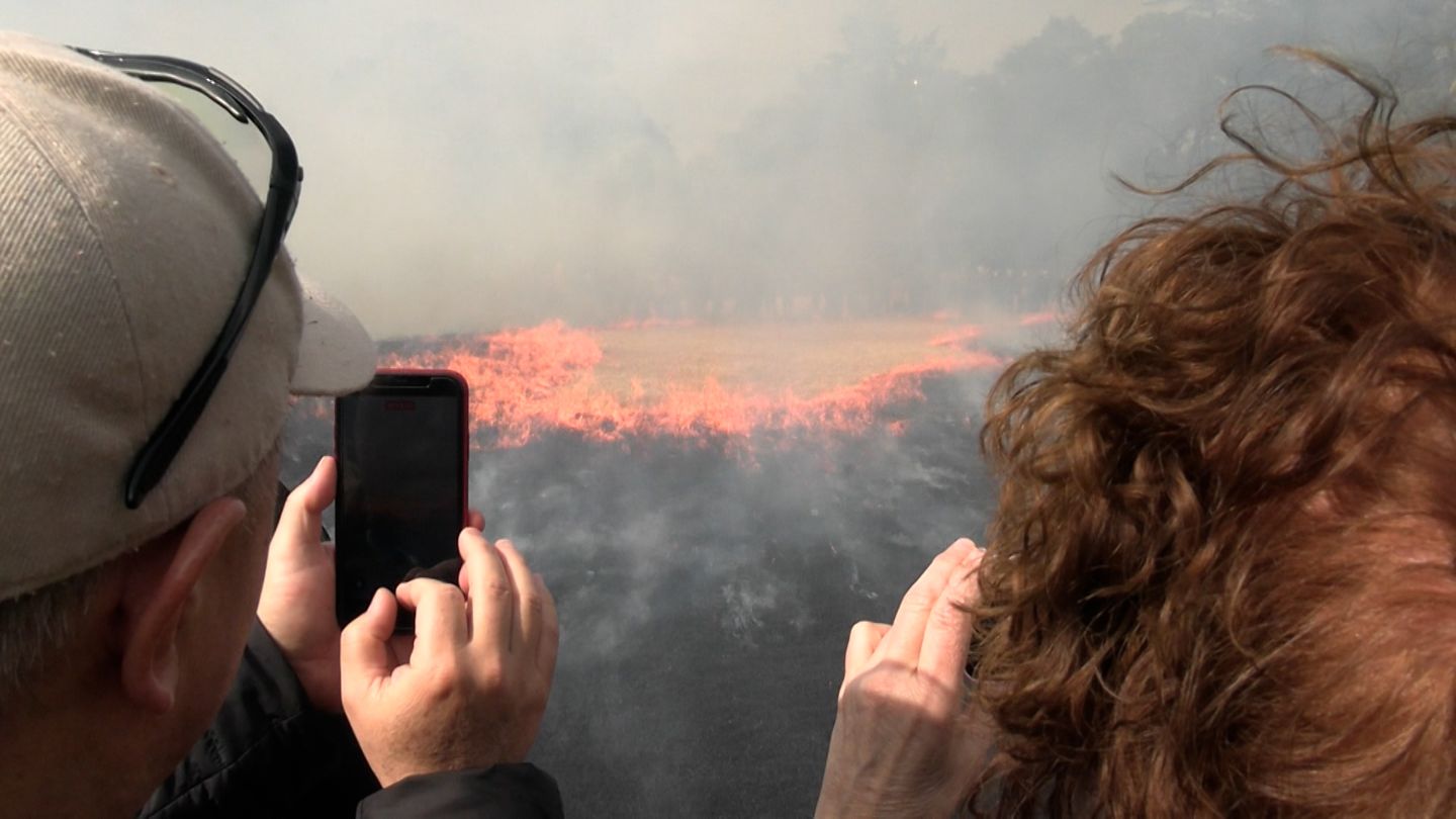 冬枯れで黄金色になった芝に松明で火をつけると炎が上がります。