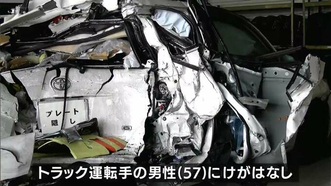 【防犯カメラ映像】衝突の瞬間、ブレーキ音響き…木材積んだ大型トラックの対向車が前方大破 トラック運転手が病院搬送 熊本県菊陽町・国道443号