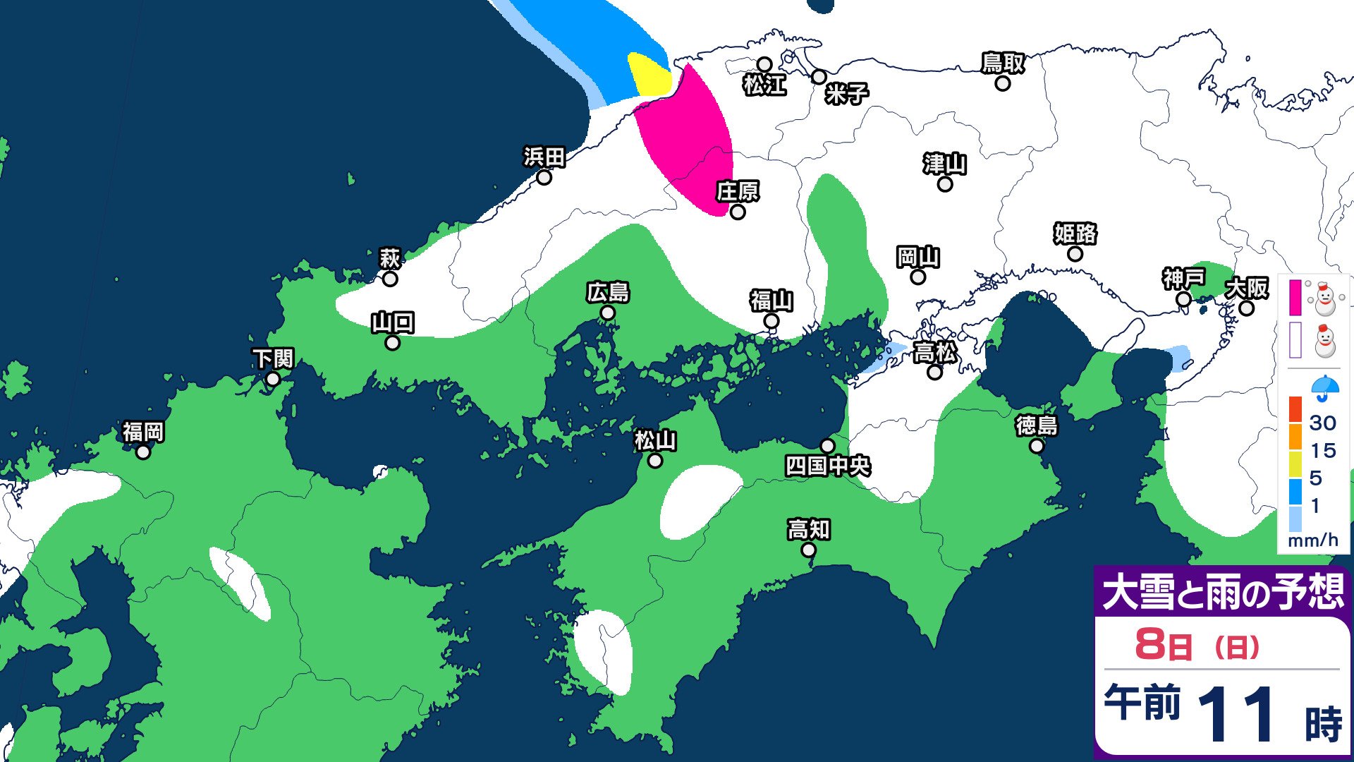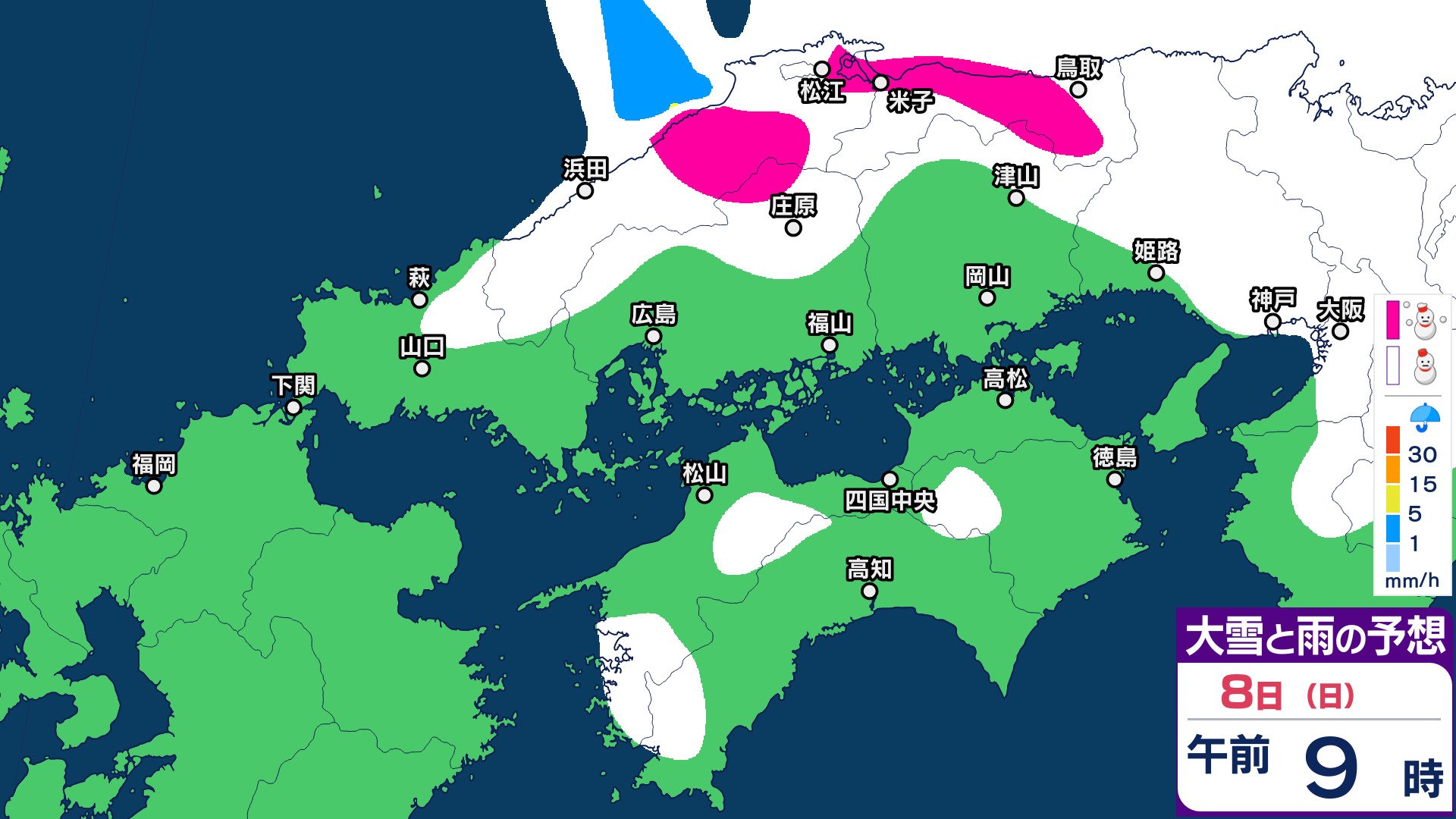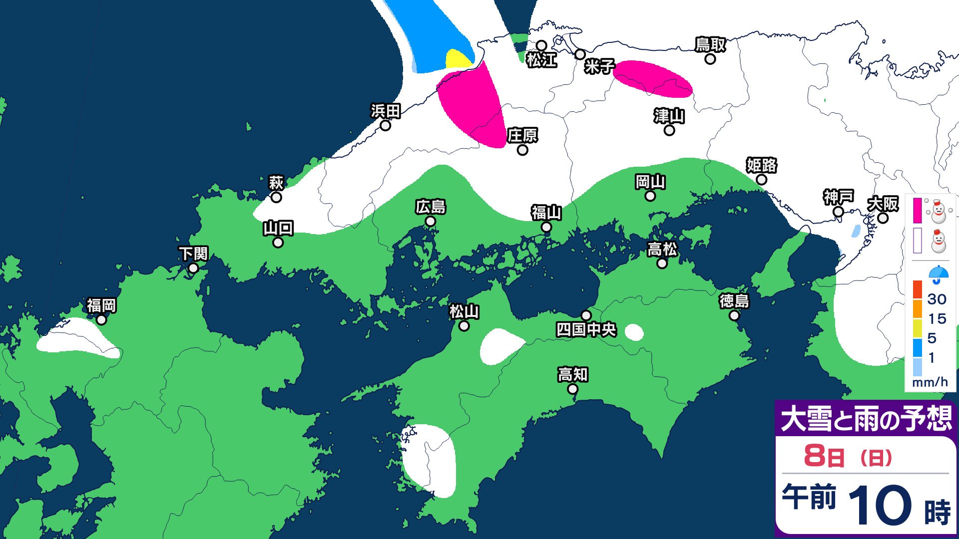 【四国地方の雪の予想】香川・愛媛・高知・徳島 2月7日(土)~9日(月)1時間ごとの雪雨シミュレーション【気象庁 7日午後1時更新】 2026年2月7日(土) 13:00 香川 天気 8日(日) 気象庁によりますと、 【四国地方】 8日6時から9日6時までに予想される24時間降雪量は多い所で、 平地 7センチ 山地 20センチ が予想されています。 ▶7日(土)~9日(月)中国・四国地方の雪雨シミュレーション画像 ▶7日(土)~9日(月)中国・四国地方の雪雨シミュレーション画像