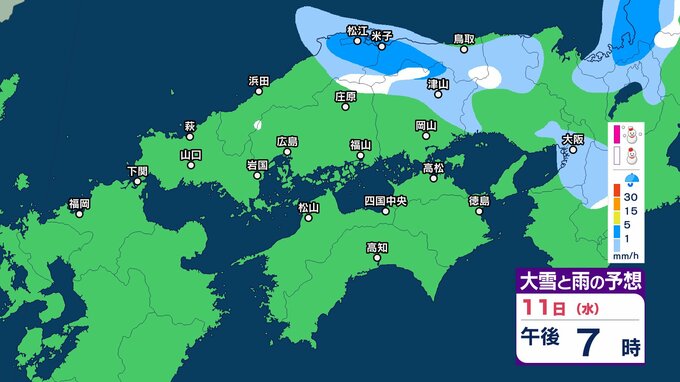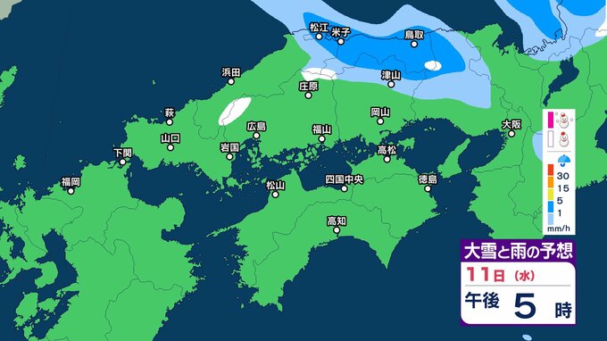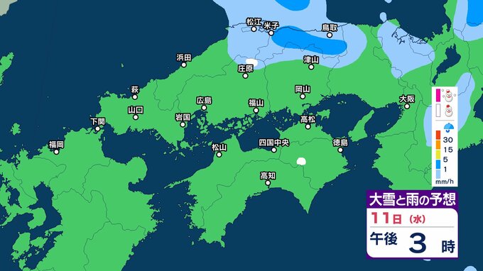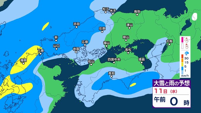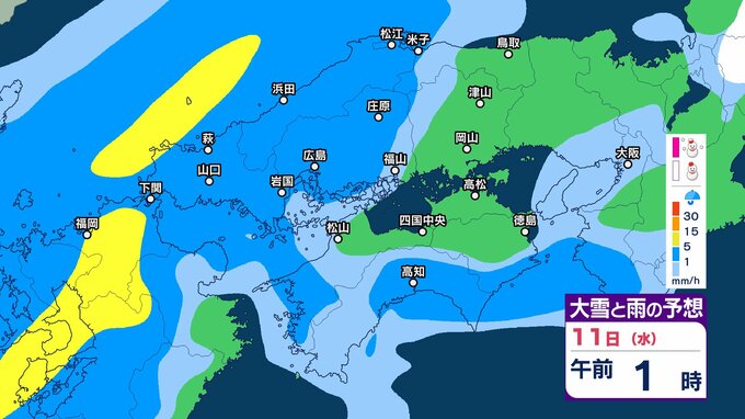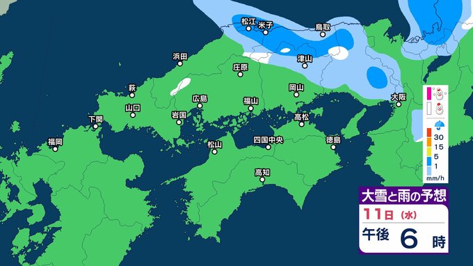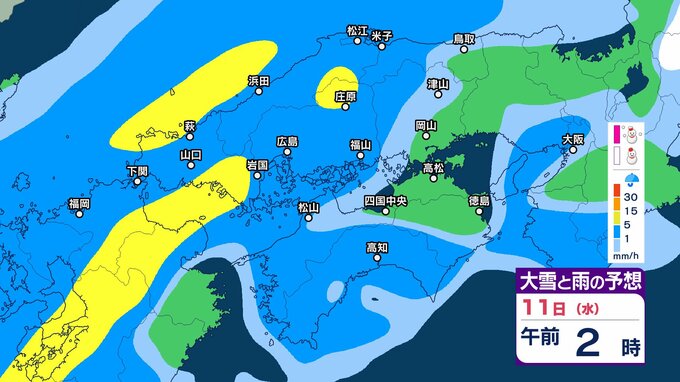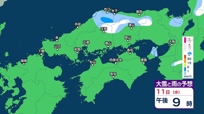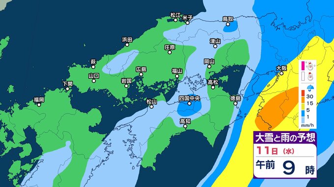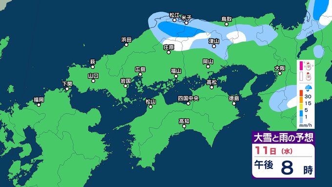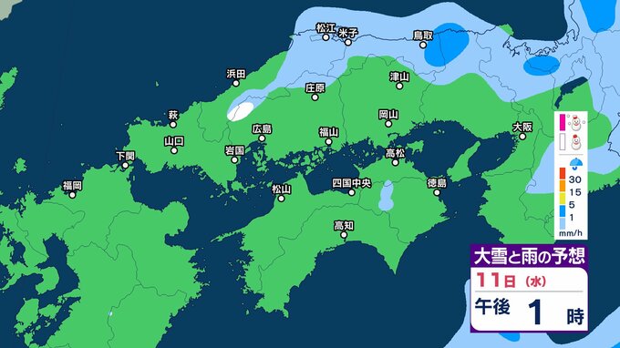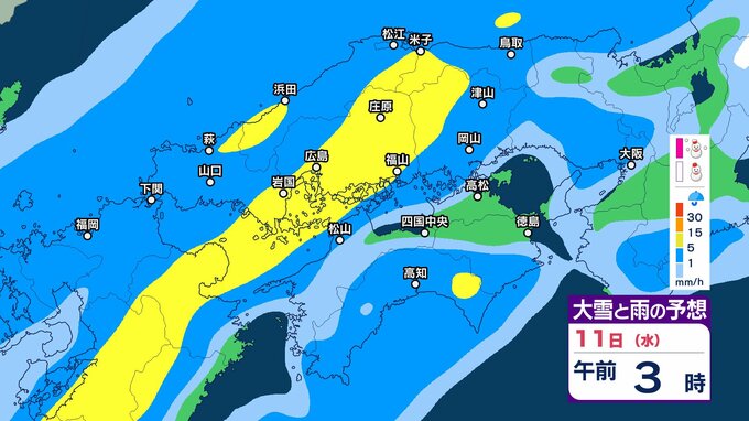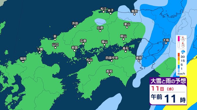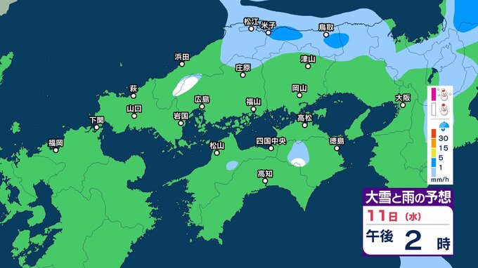 【中国・四国地方の雪の予想】広島・岡山・山口・鳥取・島根・香川・愛媛・高知・徳島 2月8日(日)~11日(祝・水)1時間ごとの雪雨シミュレーション【気象庁 8日現在】 2026年2月8日(日) 18:39 香川 11日(水) 8日(日)~11日(祝・水)中国・四国地方の雪雨シミュレーション画像 8日(日)~11日(祝・水)中国・四国地方の雪雨シミュレーション画像 ※GSM(シミュレーション)は比較的大まかに雨・雪雲を予想する傾向があるため、局地的には雨・雪が降らないこともあります。予想にはブレ幅がありますので、最新の気象情報を確認してください。