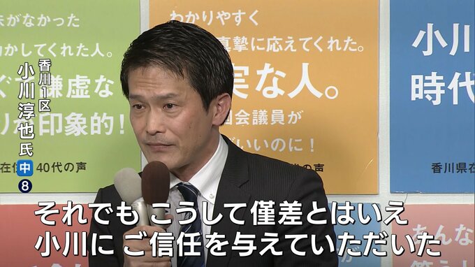 「戸惑われた部分も多々あったことと思います。それでもこうして僅差とはいえ小川にご信任を与えていただいたその有権者の声に何としても応えてまいります」