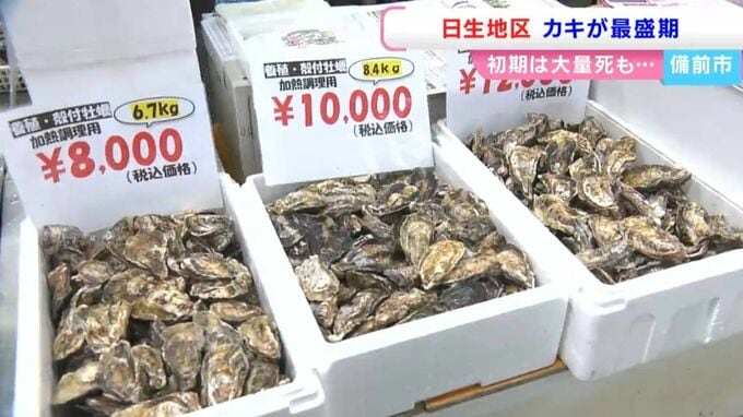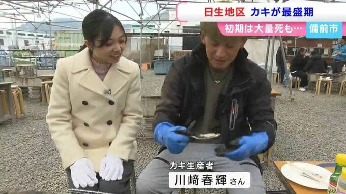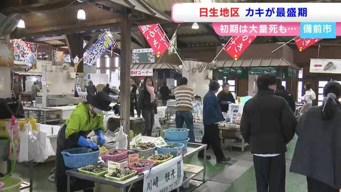 「最盛期を迎えた日生のカキ。きょうもたくさんのカキがずらっと並んでいますよ。そして、お客さんもきていて賑わってますね」
