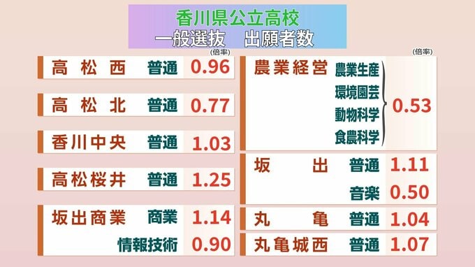 【高校入試2026】香川県公立高校 一般選抜最終倍率 高松(普通)1.09倍 高松工芸(電気)1.48倍 高松南(普通)1.45倍【30校全倍率掲載】 2026年2月24日(火) 18:00 香川 高松西、高松北、香川中央、高松桜井、坂出商業、坂出、丸亀・丸亀城西・農業経営 【画像一覧】香川県公立高校 一般選抜出願者数