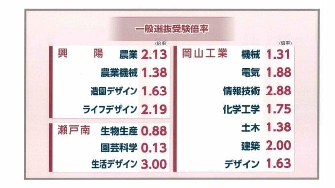 【高校入試2026】岡山県公立高校 一般選抜入試最終倍率 【全校掲載】 2026年2月27日(金) 13:05 岡山 興陽・瀬戸南・岡山工業 【画像一覧】各高校の受験倍率 瀬戸南の生活デザインは3.00倍と全学校・学科の中で最も高くなっています。岡山工業の情報技術は2.88倍です。