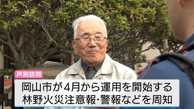 消防職員らが岡山市南区宮浦地区の31世帯を訪ね、火の取り扱いや、来月から岡山市で運用が始まる林野火災警報・注意報について周知しました。