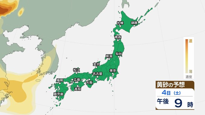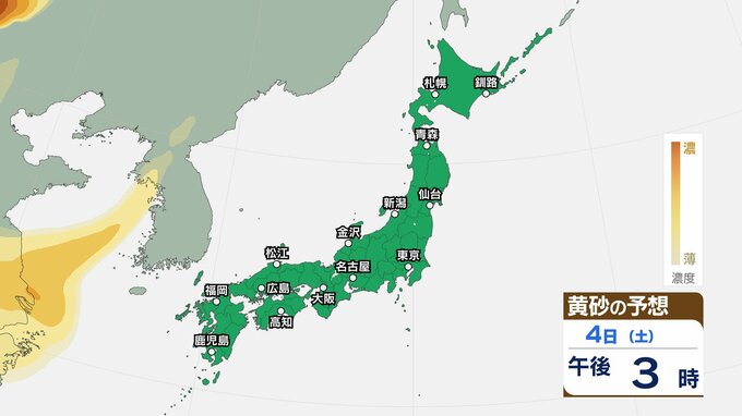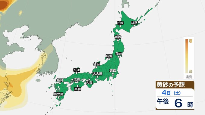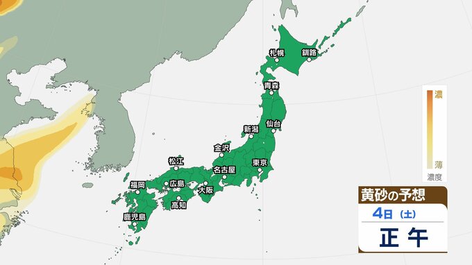 【黄砂情報】5日(日)九州・中国の広い範囲で影響の可能性 日本列島に黄砂が飛来か…【気象庁 黄砂シミュレーション/4日現在】 2026年4月4日(土) 10:11 香川 天気 4日(土) 4日(土)~7日(火)黄砂シミュレーション 4日(土)~7日(火)黄砂シミュレーション