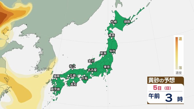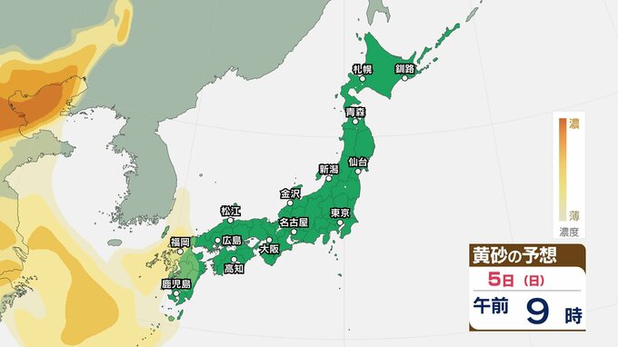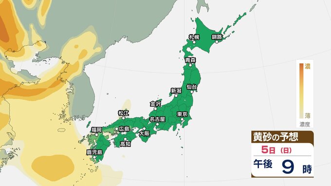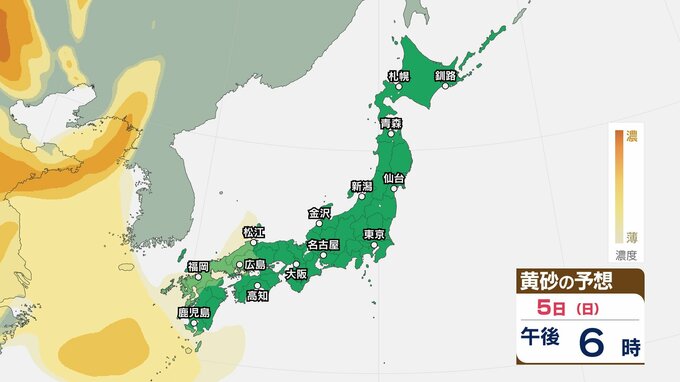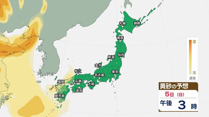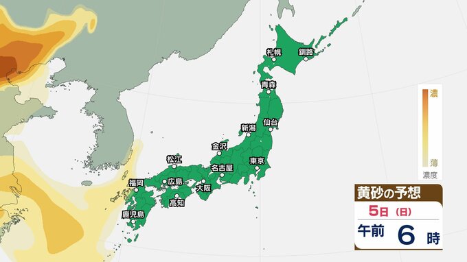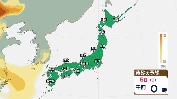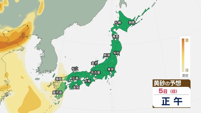 【黄砂情報】5日(日)九州・中国の広い範囲で影響の可能性 日本列島に黄砂が飛来か…【気象庁 黄砂シミュレーション/4日現在】 2026年4月4日(土) 10:11 香川 天気 5日(日) 4日(土)から7日(火)黄砂シミュレーション 4日(土)~7日(火)黄砂シミュレーション