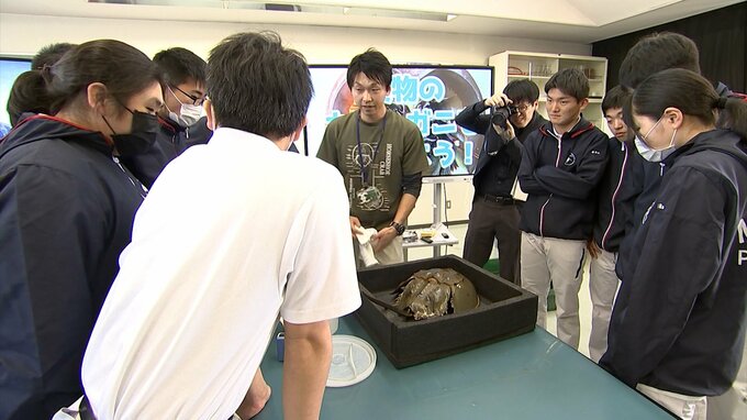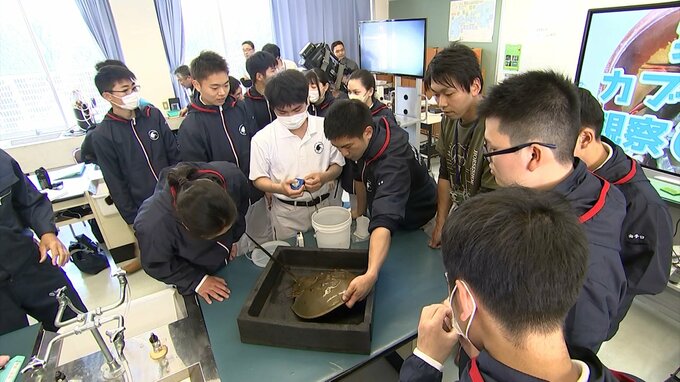 香川県で見つかった例は珍しく、カブトガニの生態を学ぶ機会をと、多度津高校の海洋生産科の3年生を対象に特別授業が開かれました。