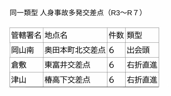 倉敷東警察署管轄の倉敷市にある東富井交差点と、津山警察署管轄の津山市にある椿高下交差点では、それぞれ「右折直進」の事故が6件発生しました。