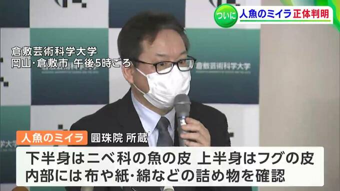 倉敷市の倉敷芸術科学大学では先ほど(7日午後)「人魚のミイラ」研究プロジェクトチームの最終報告会見が開かれました。生物学だけでなく民俗学的な調査の結果も報告されました。