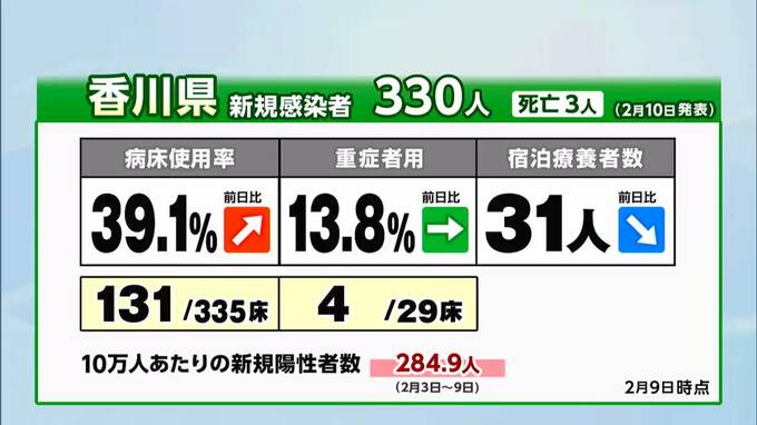 香川県では330人の感染と、80代の男性と女性、それに90代以上の男性のあわせて3人の死亡が発表されました。病床使用率はきのう時点で39.1%と前の日よりも増加したものの、重症者用は13.8%と横ばいです。