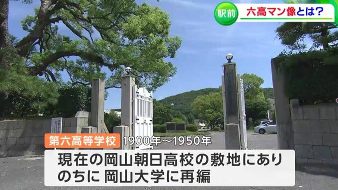 現在の岡山朝日高校の敷地にあり、のちに岡山大学に再編された六高。ナンバースクールと呼ばれる、明治政府が優秀な人材を育てるために作った8つの高校の一つで、名前の通り六番目に開校しました。ちなみに東北大学には「二高マン」像が、熊本大学には「五高マン」像が立っています。