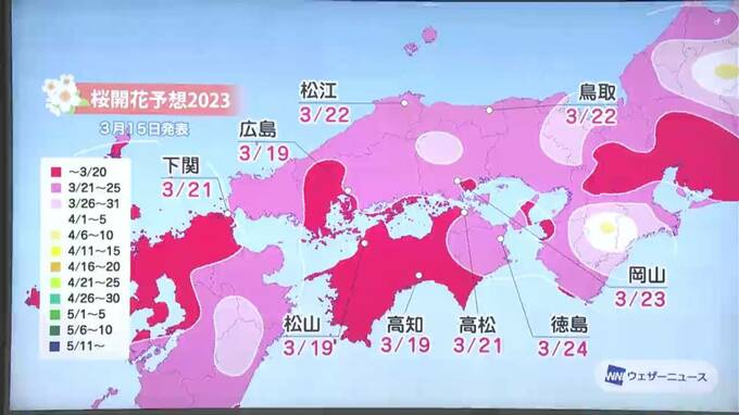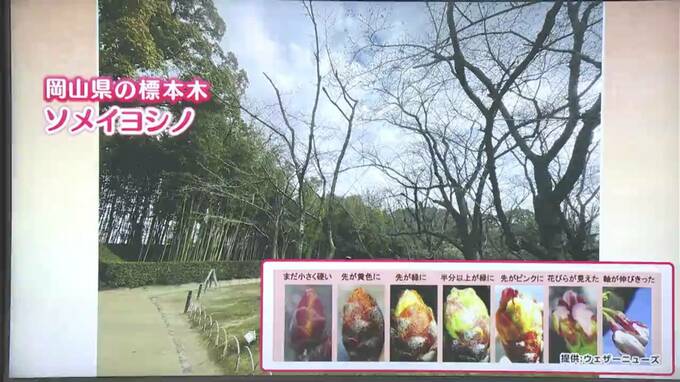 ウェザーニューズでも、春分の日・3月21日ごろから各地で開花が始まり、「岡山では23日」「高松では21日」に開花と予想しています。