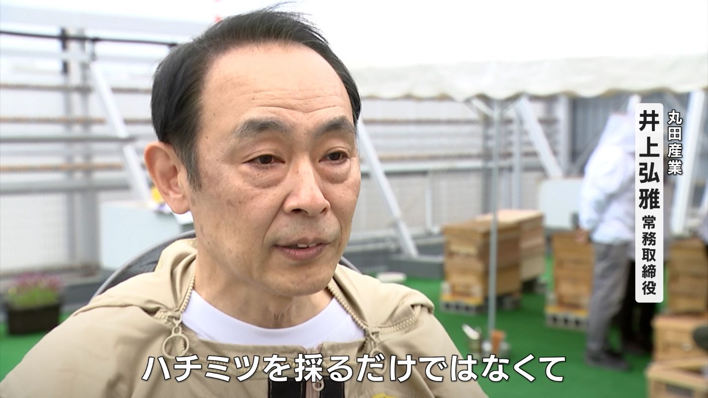 (丸田産業 井上弘雅常務取締役)「ハチミツを採るだけはなくて、生物多様性の大切さや、環境、緑花活動の大切さなどを、採蜜を通して多くの人に知っていただきたいと思います」