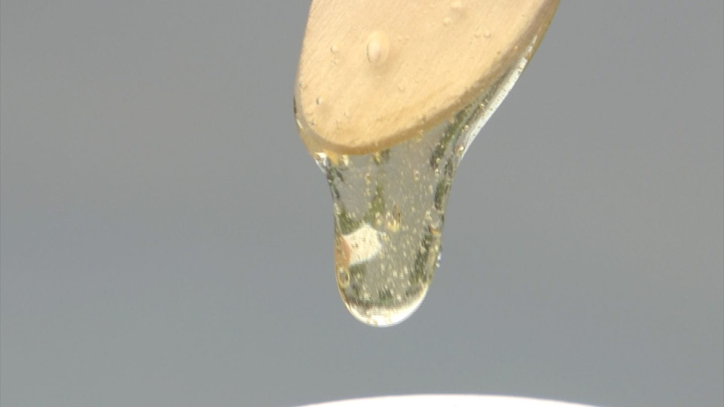 「とろ~っと、透明な黄金色のハチミツ。そのお味は…」