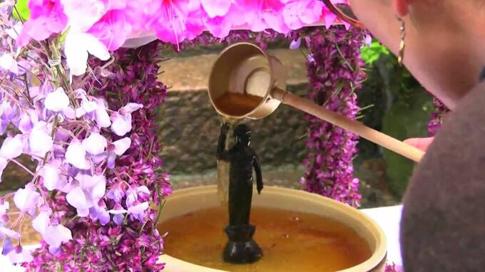 仏像に甘茶をかけ、お釈迦様の誕生を祝います。湯原温泉で毎年5月8日に行われる温泉薬師堂花祭です。