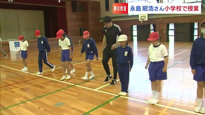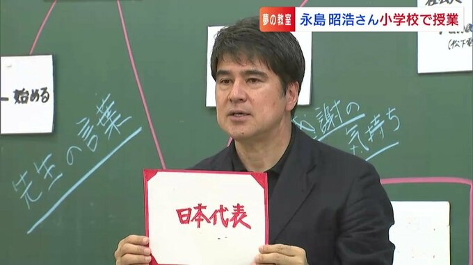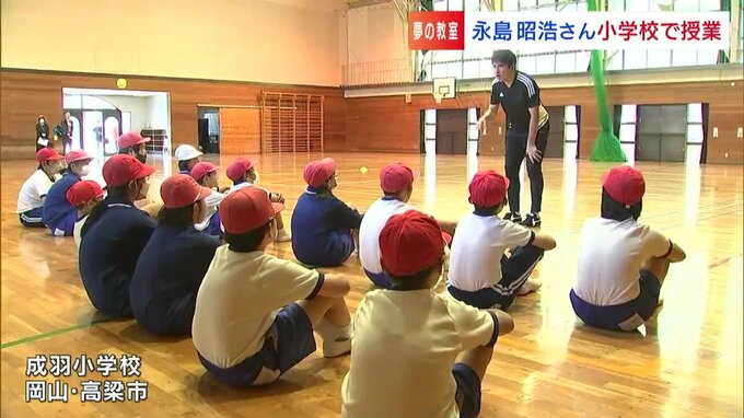 子どもたちの歓声に迎えられたのは、サッカーの元日本代表でスポーツキャスターの永島昭浩さんです。高梁市の成羽小学校で行われた「夢の教室」は、子どもたちに夢を持つことや仲間と協力することの大切さを知ってもらおうと、日本サッカー協会が全国の自治体と協力して行っているものです。
