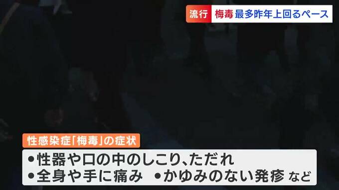 感染すると「性器や口の中のしこり」「手に発疹」などの症状などが発症する、性感染症「梅毒」です。全国的にも感染者はこの10年で10倍に増加し、昨年は統計史上、最多の約13,200人が感染しています。
