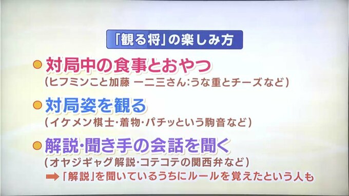 最近、耳にした方もいらっしゃるかもしれません。「観る将」(みるしょう)と読みまして、将棋は指さないけれど、試合は観戦するファンの方々を指すんです。何を楽しみに観るのか。分かりますか?
